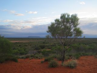 Then it was to the sunset viewing area to see Uluru as the sun went down. We snapped a few photos of the rock before the sun went down and enjoyed a pasta dinner. Other tour groups filled the lot one busload at a time. Some even offered their tourists chairs and tablecloth-covered tables with champagne. We all laughed at this as we drank our own chilled beverages from the Eski. The clouds rolled in before sunset, so the view was not so great. So we like all the other buses, packed up and headed to the campsite for a good nights' rest...or so we thought.