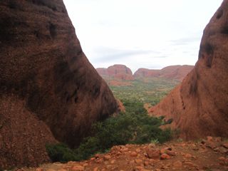 That night we all slept around the fire in our swags (sleeping bag covers that have a mattress pad in it). The cloud coverage made it so warm that most of us slept with our swags and sleeping bags fully un-zipped. Jared woke us up at 5:00am to show us the stars that had become visible. After brekki (wheat biscuits and fruit, toast, cereal, and coffee or tea) we loaded up and headed to Kata Tjuta and the Valley of the Winds.