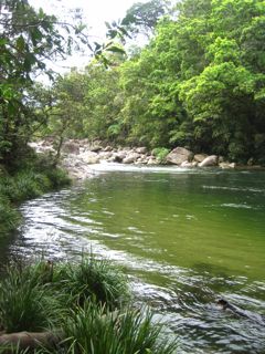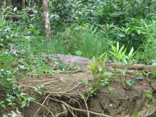 We winded around curvy bends in the road, which in turn made me feel sick, so I dosed off. I awoke at our first stop, the Daintree River. After a quick morning tea we loaded the boat for our cruise. I sat by the rail, ready to search the water and banks for “Saltys.” Soon enough our driver was pointing out a big one, a 4-meter croc that that was lazing on the left hand bank. We headed up the river further looking for crocs and within a few minutes came across a smaller one basking in the sun with it’s mouth open. I was surely glad that we ended up not encountering any crocs in the water…or at least, none that we saw.