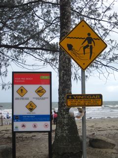 Along our way out of the rainforest to Port Douglas we stopped at a lookout that offered a fantastic view of the beaches below and then continued onward. When we got to Port Douglas we had some free time to explore the town. It reminded me of places along the Oregon Coast that offer nothing more than small souvenir shops. We walked to the beach where the wind was blowing so hard we had to shield our eyes with our sunglasses. Sign everywhere warned of the dangers of the water. One thing I learned was that if stung by a jellyfish you should pour vinegar on it.